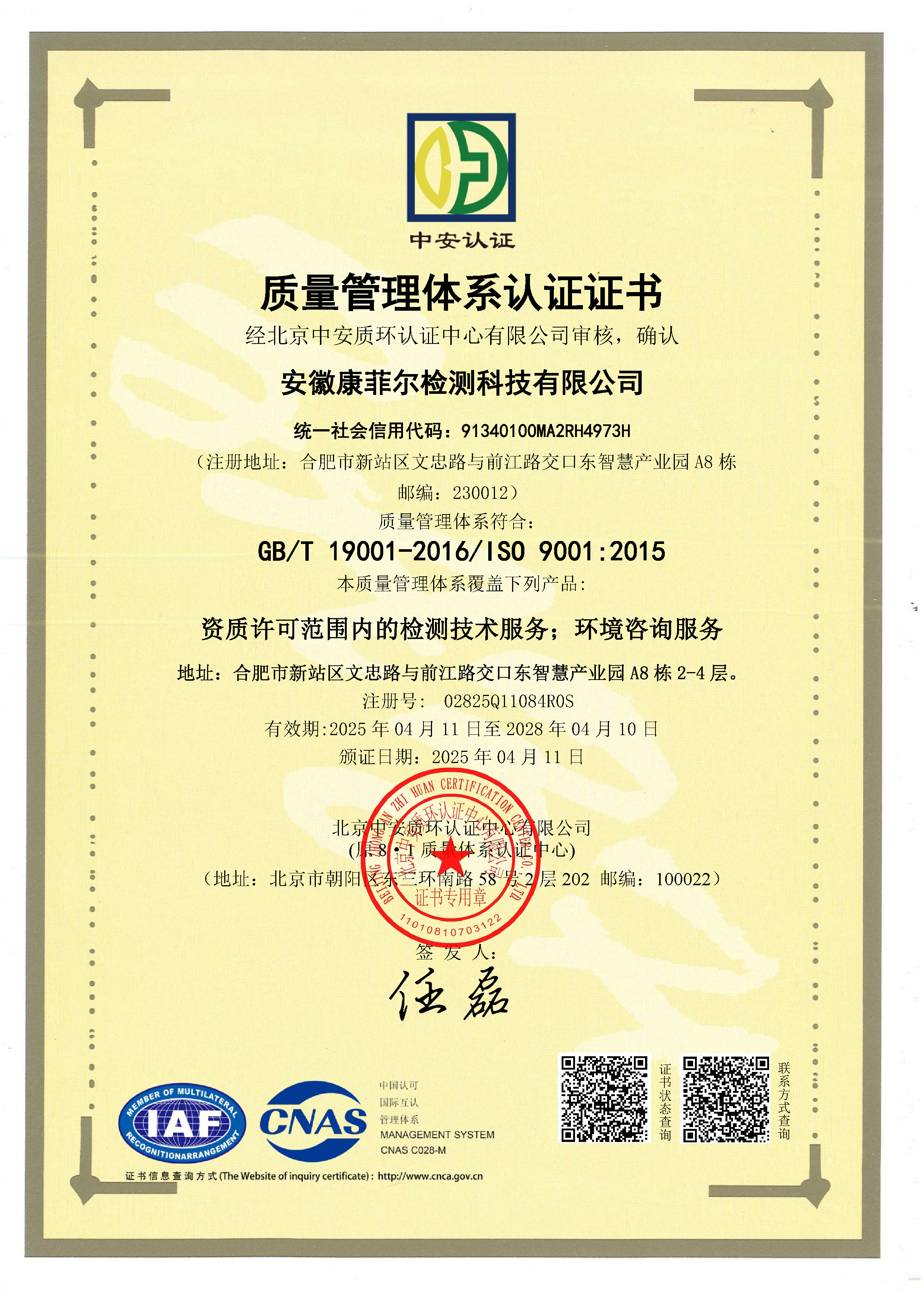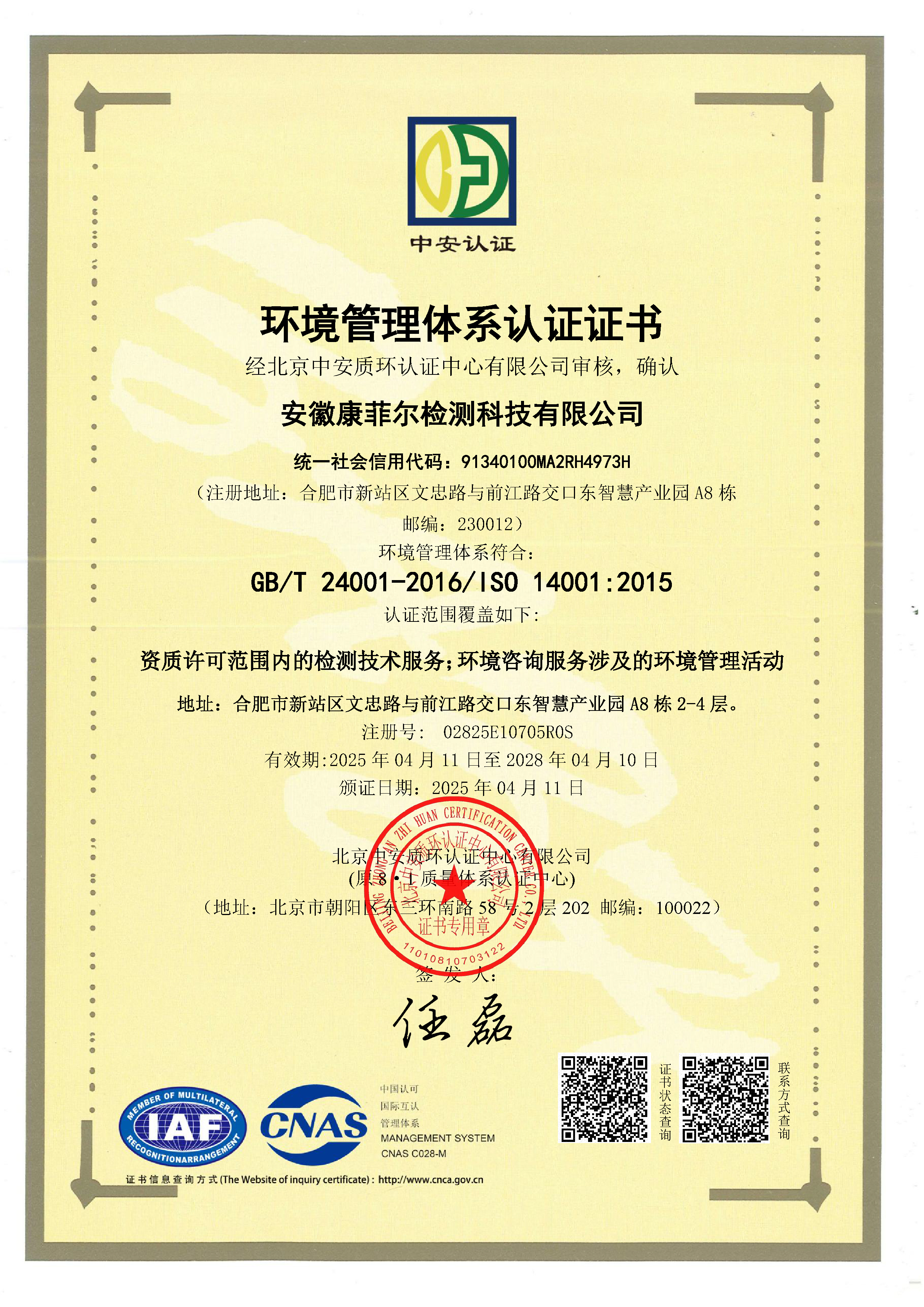 環(huán)境管理體系認(rèn)證證書
